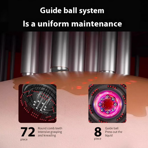 Eight liquid-guiding roller balls evenly press and dispense oil/serum while 72 rounded teeth massage the scalp to promote absorption and stimulate follicles—delivering product directly to roots with minimal waste.